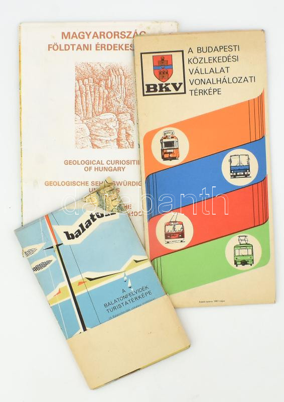 Beschreibung: 3 db térkép: Magyarország földtani érdekességei, A Balatonfelvidék turistatérképe (sérült), BKV vonalhálózati térkép
