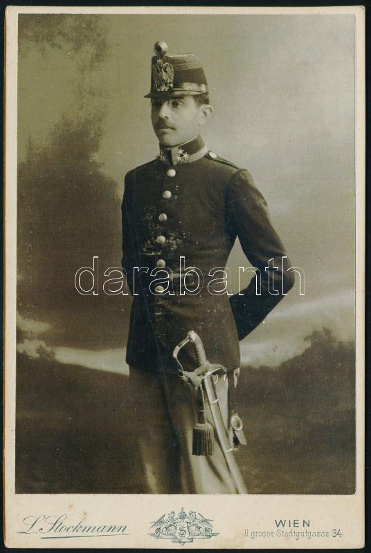 Beschreibung: cca 1900-1915 Tüzér őrmester portréja díszkarddal és monoklival, keményhátú fotó L. Stockmann bécsi műterméből, 16,5×11 cm;