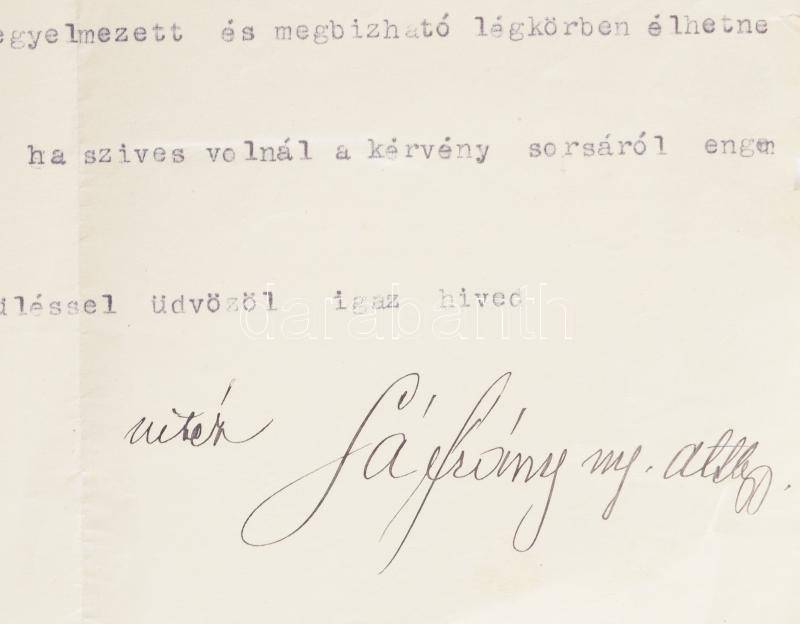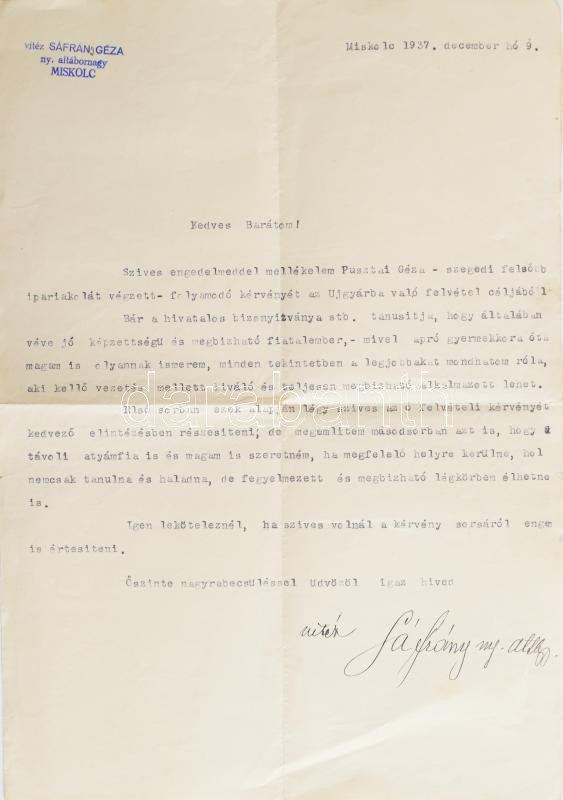 Beschreibung: vitéz Sáfrány Géza ny. altábornagy a miskolci 10. honv gyalogezred autográf aláírással és pecséttel ellátott levele