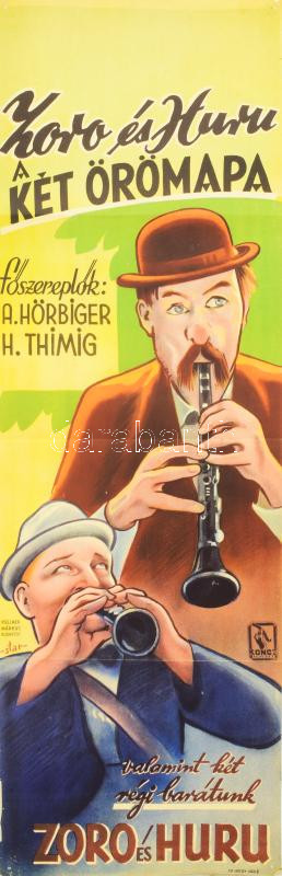 1943 Zoro és Huru, a két örömapa. Moziplakát (filmplakát, rácsplakát). Attila Hörbiger, Hans Thimig és mások szereplésével. Litográfia, papír. Koncz film. Kellner Márkus Bp. Apró lapszéli szakadásokkal. Hajtásnyomokkal. 96x31 cm. / Vintage rare Hungarian movie poster, lithograph on paper, small tears on the edges