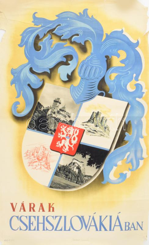cca 1930-1940 Várak Csehszlovákiában. Magyar nyelvű idegenforgalmi, turisztikai plakát. Litográfia. Červený Kostelec, [Josef] Doležal kiadása. Sérült, gyűrődésekkel, szakadásokkal, néhány kisebb lapszéli hiánnyal, feltekerve, 85x56 cm