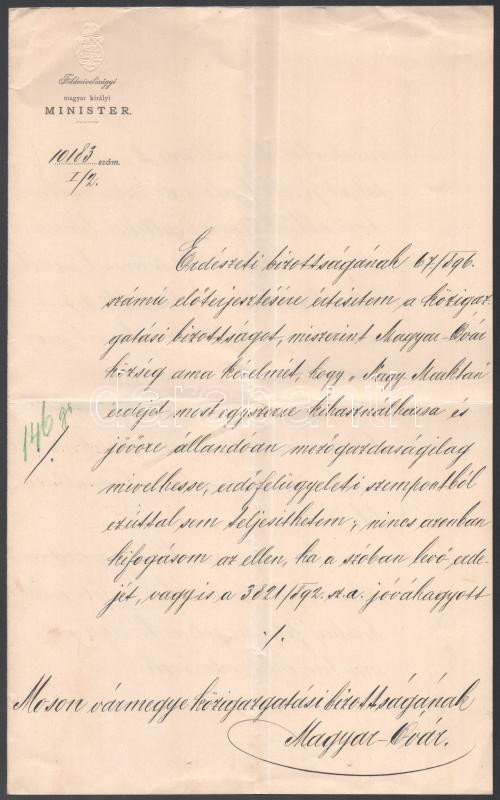 Beschreibung: 1897 Darányi Ignác (1849-1927) földművelésügyi miniszter aláírásával ellátott hivatalos levél Mosonmagyaróvár erdeinek hasznosítása tárgyában