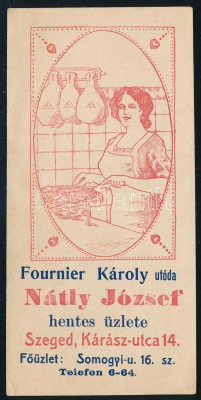 Fournier Károly utóda Nátly József hentes üzlete, Szeged, számolócédul... https://www.darabanth.com/de/473-Fernauktion/473.0/Kunst-Dokumente-andere-Sammelgebiete/Werbungen~1000001/Fournier-Karoly-utoda-Natly-Jozsef-hentes-uzlete-Szeged-szamolocedula~II3212527