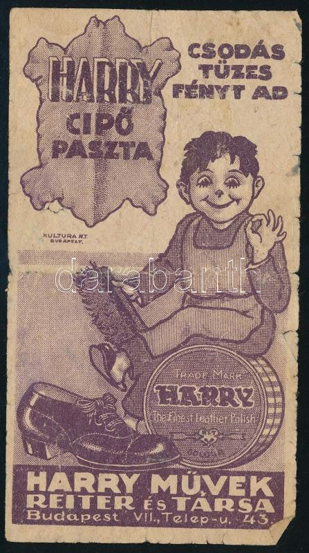 Harry cipőpaszta számolócédula, kissé sérült https://www.darabanth.com/de/473-Fernauktion/473.0/Kunst-Dokumente-andere-Sammelgebiete/Werbungen~1000001/Harry-cipopaszta-szamolocedula-kisse-serult~II3212543