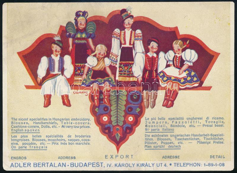 cca 1930-1940 Adler Bertalan (Bp. IV., Károly király út 4.) magyaros kézimunkák, szuvenírek üzlete, többnyelvű, színes grafikával illusztrált reklámlap, szign.: Vándor Endre (1910-?), 14,5x10,5 cm