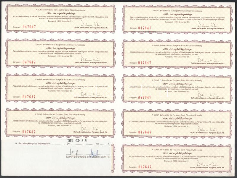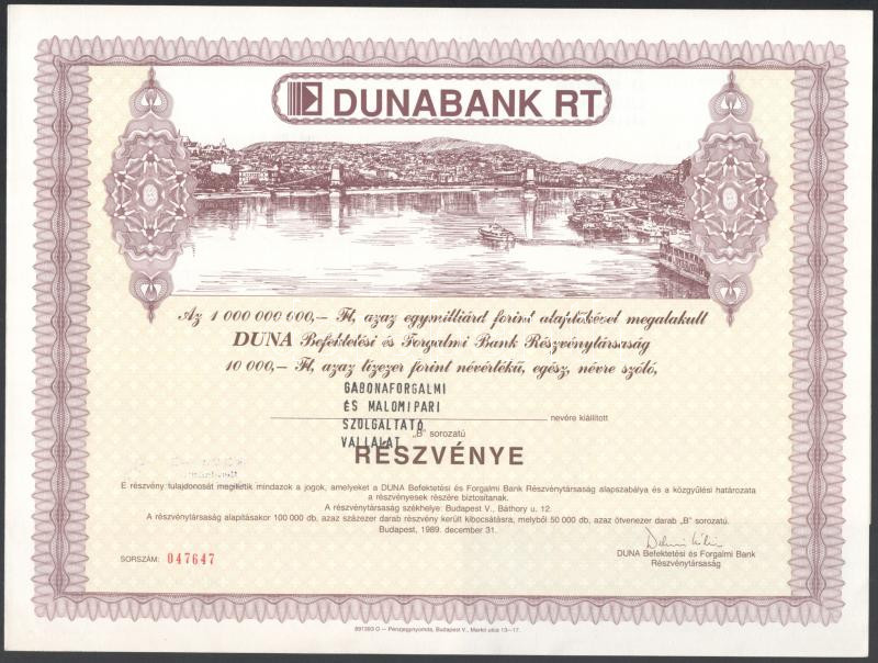 1989. "Dunabank Rt." részvénye 10.000Ft-ról, bélyegzéssekkel... https://www.darabanth.com/de/473-Fernauktion/473.0/Numismatik/Aktien-und-Tickets~1500006/1989-Dunabank-Rt-reszvenye-10000Ft-rol-belyegzessekkel-szelvenyekkel-TAU~II3191610