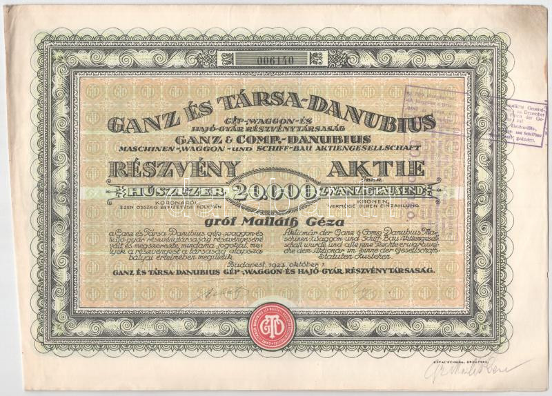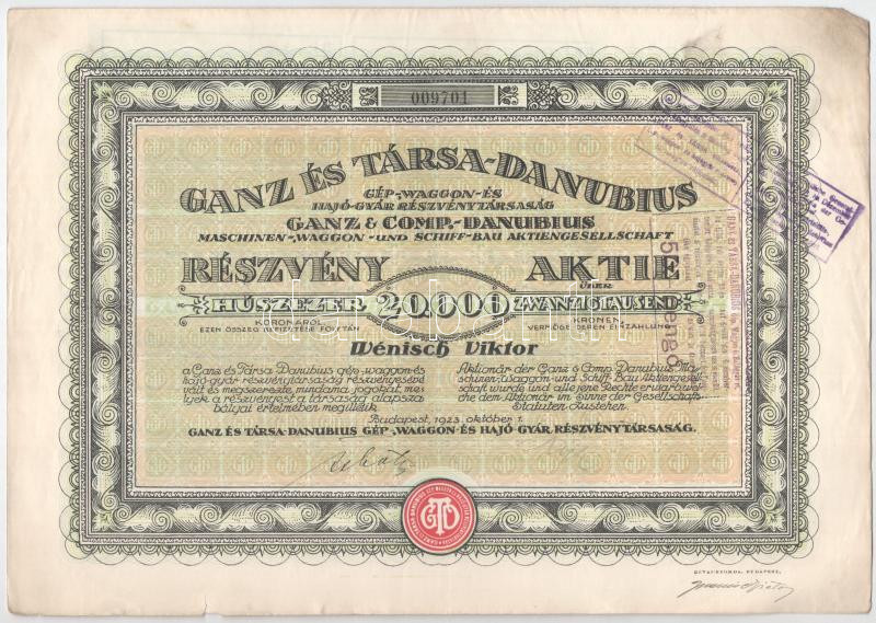 Budapest 1923. "Ganz és Társa- Danubius Gép-, Waggon- és Hajó-Gyár Részvénytársaság" névre szóló részvénye 20.000K-ról, magyar és német nyelven, szárazpecséttel, bélyegzésekkel és szelvényekkel (2x) T:VF folt