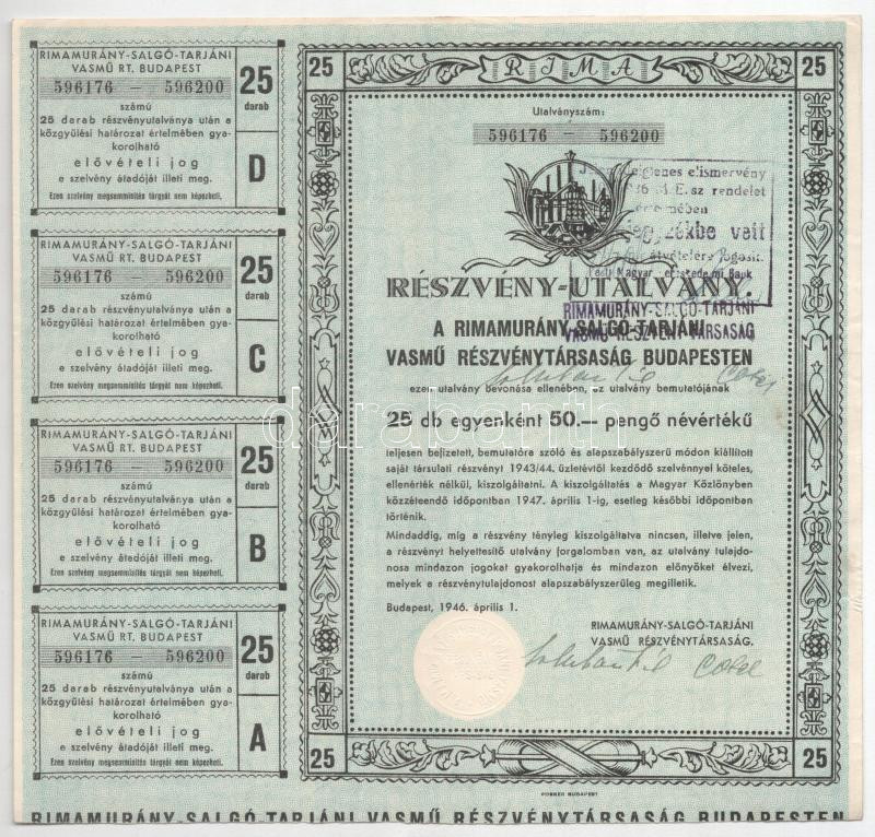 Budapest 1946. "Rimamurány-Salgó-Tarjáni Vasmű Részvény-Társaság ... https://www.darabanth.com/de/473-Fernauktion/473.0/Numismatik/Aktien-und-Tickets~1500006/Budapest-1946-Rimamurany-Salgo-Tarjani-Vasmu-Reszveny-Tarsasag-Budapesten-reszvenyutalv~II3207743