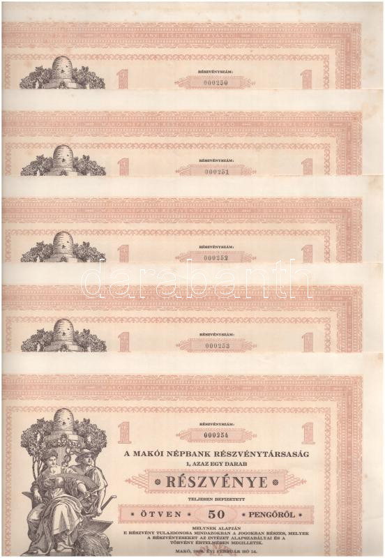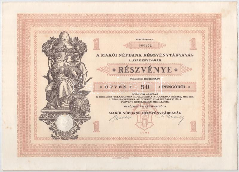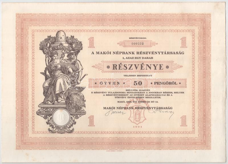 Makó 1929. "Makói Népbank Részvénytársaság" részvénye 50P-rő... https://www.darabanth.com/de/473-Fernauktion/473.0/Numismatik/Aktien-und-Tickets~1500006/Mako-1929-Makoi-Nepbank-Reszvenytarsasag-reszvenye-50P-rol-szelvenyekkel-szarazpecs~II3182891