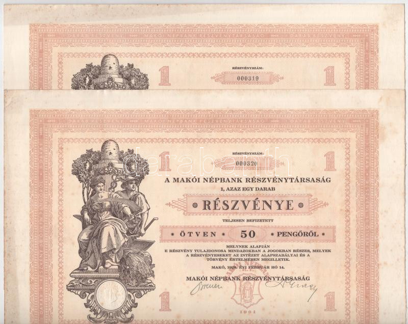 Makó 1929. "Makói Népbank Részvénytársaság" részvénye 50P-rő... https://www.darabanth.com/de/473-Fernauktion/473.0/Numismatik/Aktien-und-Tickets~1500006/Mako-1929-Makoi-Nepbank-Reszvenytarsasag-reszvenye-50P-rol-szelvenyekkel-szarazpecs~II3208014