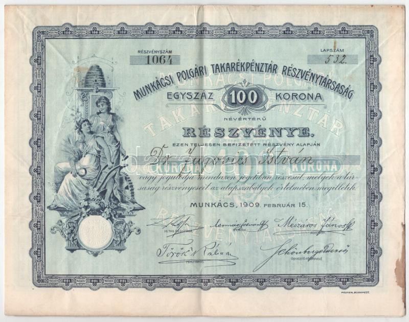 Munkács 1909. "Munkácsi Polgári Takarékpénztár Részvénytársaság&q... https://www.darabanth.com/de/473-Fernauktion/473.0/Numismatik/Aktien-und-Tickets~1500006/Munkacs-1909-Munkacsi-Polgari-Takarekpenztar-Reszvenytarsasag-nevre-szolo-reszveny~II3205368