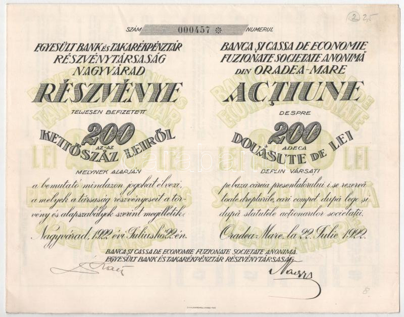 Nagyvárad 1922. "Egyesült Bank és Takarékpénztár Részvénytársaság... https://www.darabanth.com/de/473-Fernauktion/473.0/Numismatik/Aktien-und-Tickets~1500006/Nagyvarad-1922-Egyesult-Bank-es-Takarekpenztar-Reszvenytarsasag-Nagyvarad-reszveny-2~II3206105