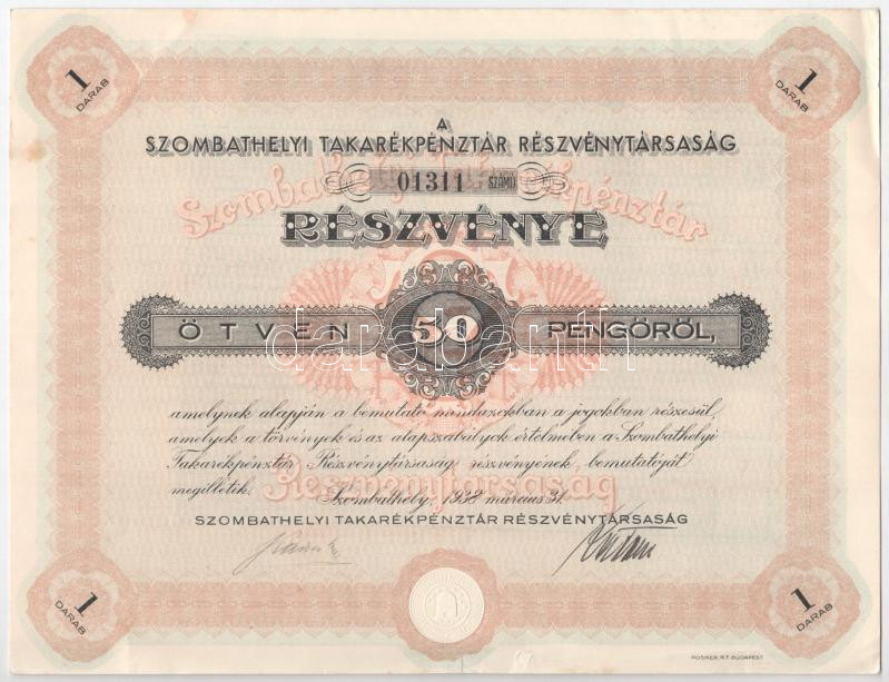 Szombathely 1938. "Szombathelyi Takarékpénztár Részvénytársaság&q... https://www.darabanth.com/de/473-Fernauktion/473.0/Numismatik/Aktien-und-Tickets~1500006/Szombathely-1938-Szombathelyi-Takarekpenztar-Reszvenytarsasag-reszvenye-50P-rol-szelvC3~II3182922