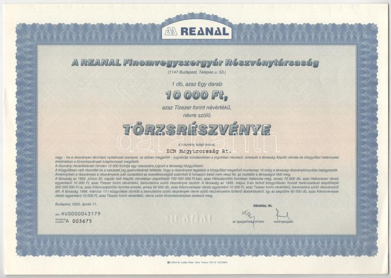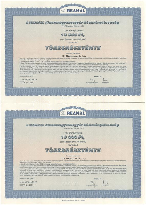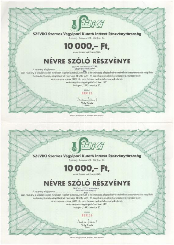 Beschreibung: Szombathely 1938. "Szombathelyi Takarékpénztár Részvénytársaság" részvénye 50P-ről, szelvényekkel, szárazpecséttel + Budapest 1939. "Hangya Termelő-Értékesítő és Fogyasztási Szövetkezet" üzletrésze 10P-ről szelvényekkel, szárazpecséttelBudapest 1995. "SZEVIKI Szerves Vegyipari Kutató Intézet Részvénytársaság" névre szóló részvénye 10.000Ft-ról (2x) sorszámkövetők, szelvényekkel, bélyegzéssel + Budapest 2000. "Reanal Finomvegyszergyár Részvénytársaság" névre szóló törzsrészvénye 10.000Ft-ról (3x) közte sorszámkövetők, szelvényekkel T:AU-VF