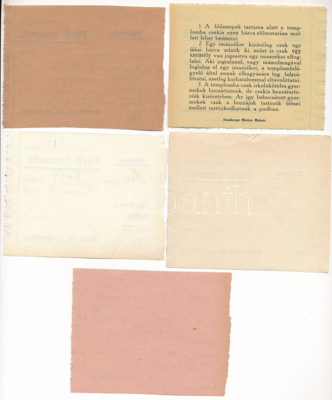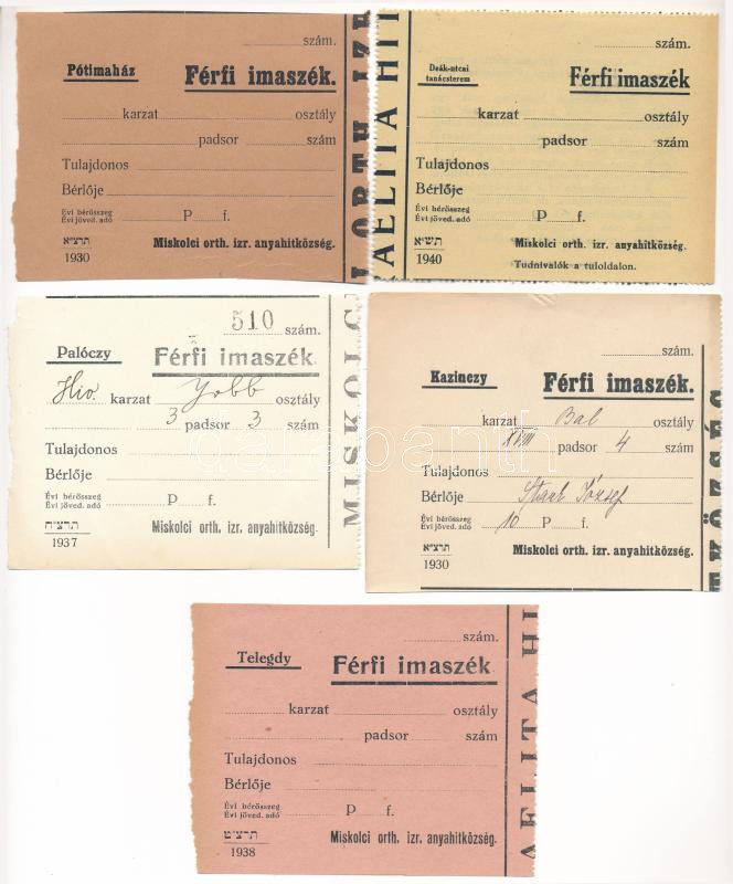 1930-1940. "Miskolci orth. izr. anyahitközség" férfi imaszékre szóló bárcák a "Deák utcai tanácsterem", "Pótimaház", "Telegdy", "Palóczy" és "Kazinczy" (5xklf) vegyesen kitöltve és kitöltetlenül