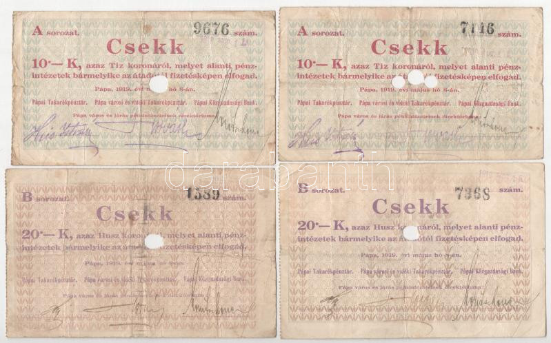 Beschreibung: Pápa 1919. május 8. "Pápai csekk" 10K (2x) + 20K (2x) mind lyukasztással érvénytelenítve és ovális szárazbélyegzővel T:F,VG Adamo PÁP-1.1,1.2