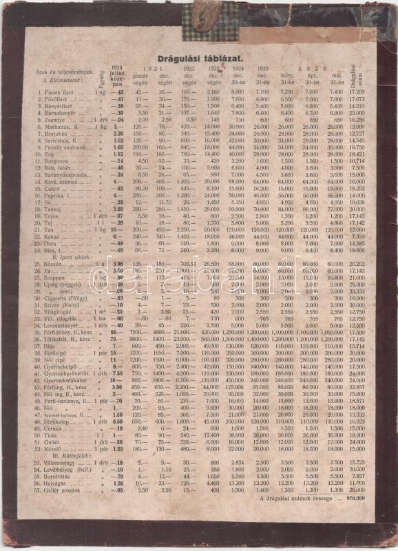 Beschreibung: ~1927. "Magyarország koronajegyei - Magyarország nehéz idejéből 1914 - 1927" drágulási táblázat 57 termék szolgáltatás áraiból, nyomta Ifj. Kellner Ernő. Szakadással