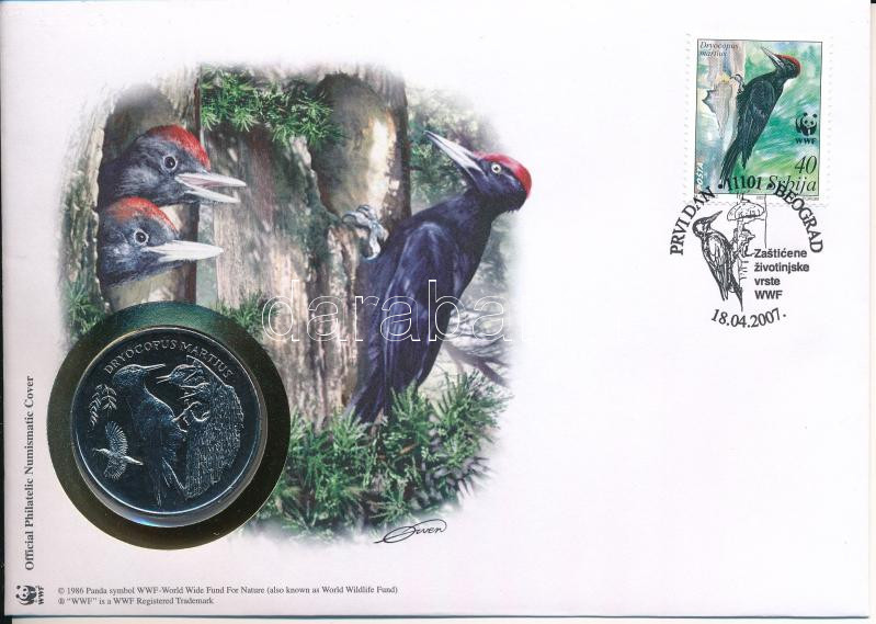 Szerbia DN (1991) "A Világ Vadvédelmi Alap (WWF) 30. évfordulója - Dryocopus Martius (Fekete harkály)" kétoldalas fém emlékérem érmés borítékban, bélyeggel és bélyegzéssel, német nyelvű ismertetővel T:PP