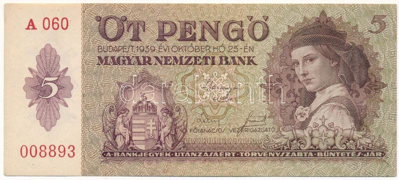 1939. 5P "A 060 008893" T:AU Adamo P6 https://www.darabanth.com/de/473-Fernauktion/473.0/Numismatik/Ungarische-Banknoten~1500008/1939-5P-A-060-008893-TAU-Adamo-P6~II3205355