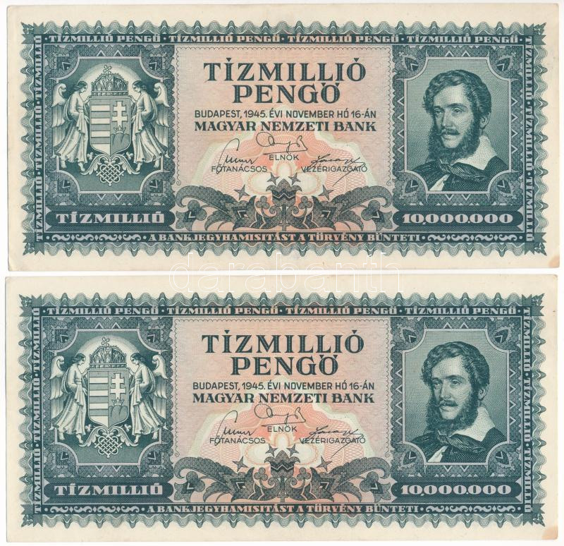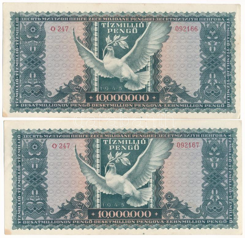 1946. 10.000.000P (2x) sorszámkövetők "O 247 092166 - O 247 09216... https://www.darabanth.com/de/473-Fernauktion/473.0/Numismatik/Ungarische-Banknoten~1500008/1946-10000000P-2x-sorszamkovetok-O-247-092166-O-247-092167-TXF-Adamo-P26~II3205469