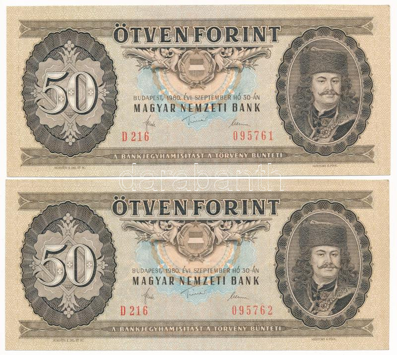 1980. 50Ft (2x) sorszámkövetők "D 216 095761 - D 216 095762"... https://www.darabanth.com/de/473-Fernauktion/473.0/Numismatik/Ungarische-Banknoten~1500008/1980-50Ft-2x-sorszamkovetok-D-216-095761-D-216-095762-nyomdai-papirranccal-TVF-F-szep-~II3208103