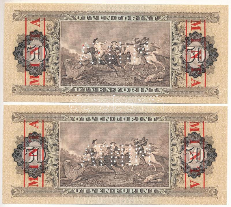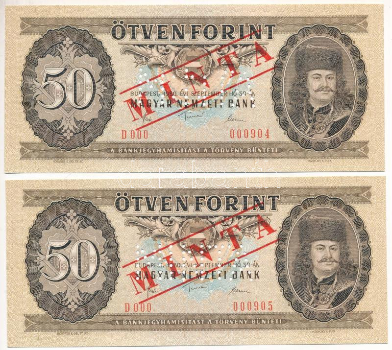Hungary 1980. 50 Forint with "MINTA (SPECIMEN)" overprint and perforation (2x), sequential serials "D000 000904 - D000 000905" serial numbers C:UNC,AU