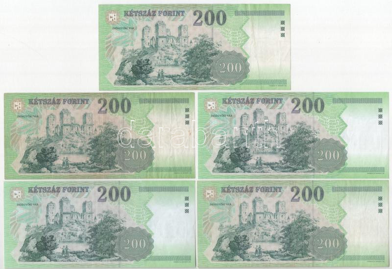 Beschreibung: 2001. 200Ft "FB" + 2002. 200Ft "FB" + 2004. 200Ft "FB" + 2005. 200Ft "FA" + 2007. 200Ft "FA" T:F közte szép papír