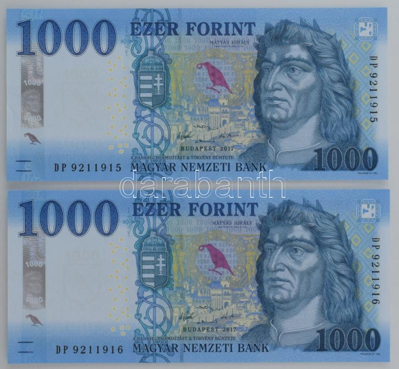 2017. 1000Ft (2x) sorszámkövetők "DP 9211915 - DP 9211916" T... https://www.darabanth.com/de/473-Fernauktion/473.0/Numismatik/Ungarische-Banknoten~1500008/2017-1000Ft-2x-sorszamkovetok-DP-9211915-DP-9211916-TUNC~II3187862