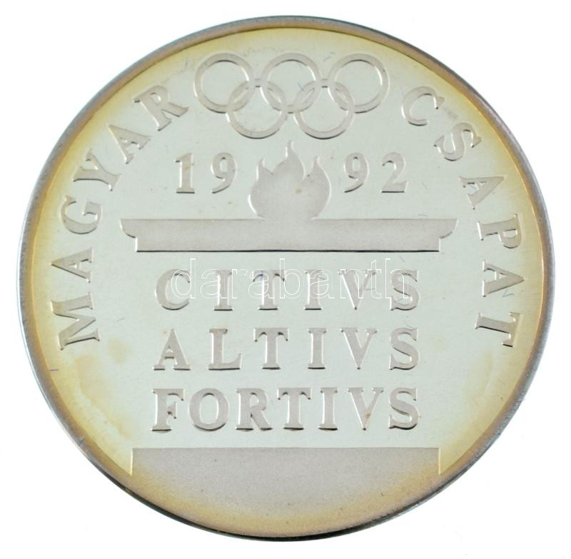 Papp László (1947-) 1990. "Magyar Csapat 1992 - CITIVS, ALTIVS, FORTIVS / Öttusa" a Barcelonában rendezett nyári Olimpia alkalmából készült, jelzetlen Ag emlékérem kapszulában, eredeti dísztokban, tanúsítvánnyal. Szign.: Papp László (31,73g/0,925/42,5mm) T:PP