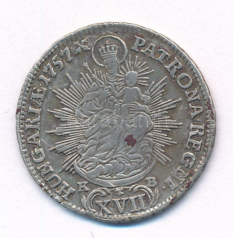 1757K-B 17kr Ag "Mária Terézia" (5,88g) T:VF karc / Hungary ... https://www.darabanth.com/de/473-Fernauktion/473.0/Numismatik/Ungarische-Munzen-und-Munzen-mit-ungarischem-Munzzeichen~1500009/1757K-B-17kr-Ag-Maria-Terezia-5-88g-TVF-karc-Hungary-1757K-B-17-Kreuzer-Ag-Maria-Theresia~II3205079