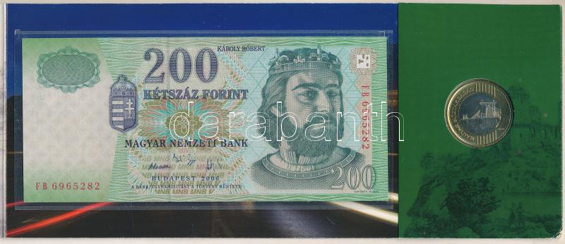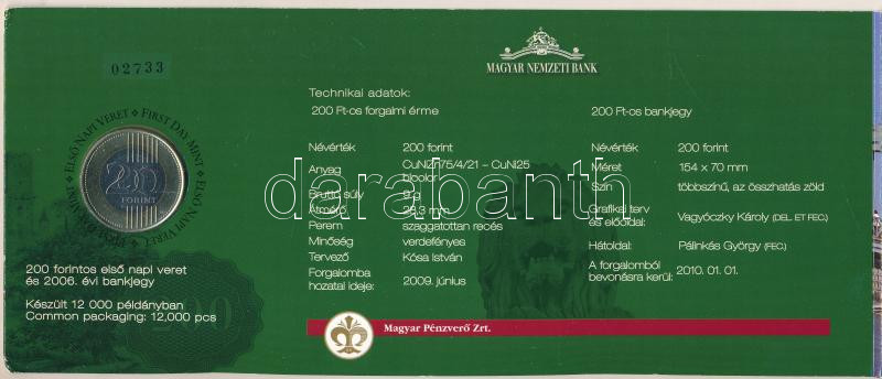 Beschreibung: 2009. 200Ft elsőnapi veret + 2006. 200Ft "FB" bankjegy "Búcsú a 200Ft-os bankjegytől", sorszámozott "02733" emléklapon T:UNC,UNC