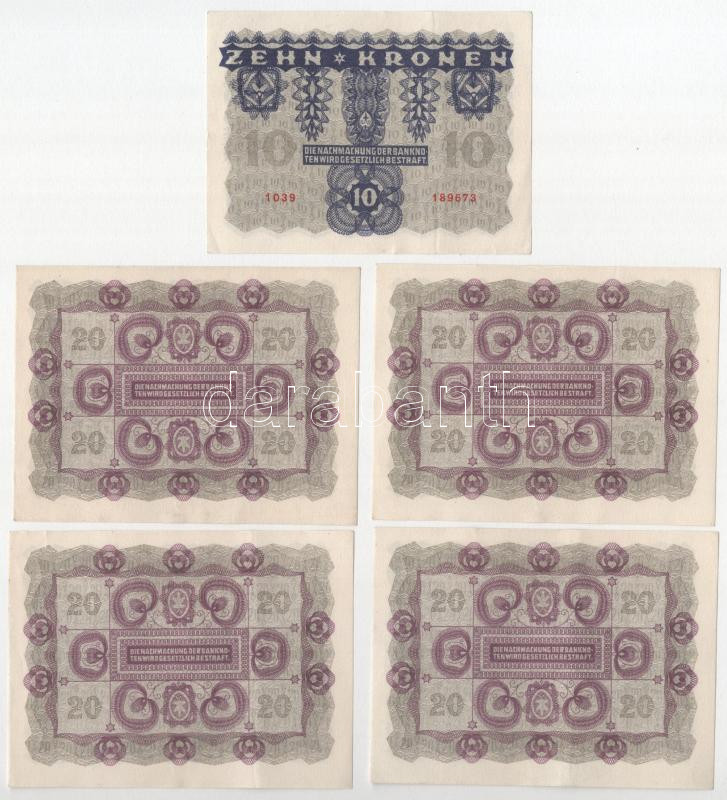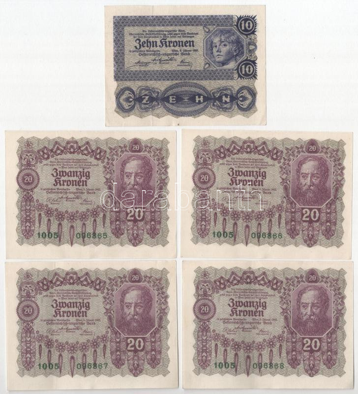 Ausztria 1922. 10k + 20K (4x) sorszámkövetők T:XF Austria 1922. 10 Kro... https://www.darabanth.com/de/473-Fernauktion/473.0/Numismatik/Weltweit-Banknoten~1500015/Ausztria-1922-10k-plus-20K-4x-sorszamkovetok-TXF-Austria-1922-10-Kronen-plus-20-Kronen-4x-consec~II3206317