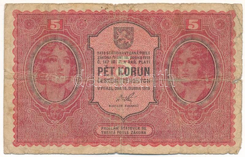 Csehszlovákia 1919. 5K T:VG Czechoslovakia 1919. 5 Korun C:VG Krause P... https://www.darabanth.com/de/473-Fernauktion/473.0/Numismatik/Weltweit-Banknoten~1500015/Csehszlovakia-1919-5K-TVG-Czechoslovakia-1919-5-Korun-CVG-Krause-P237~II3210291