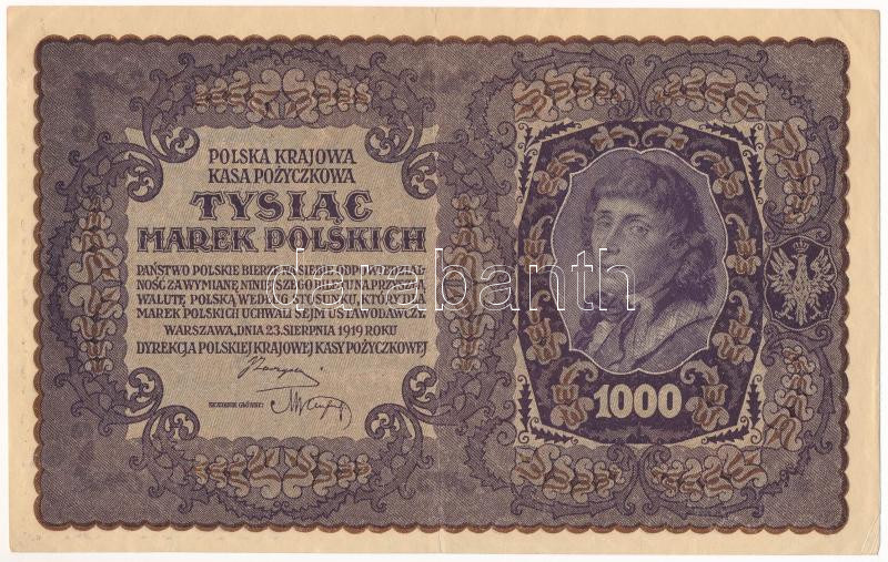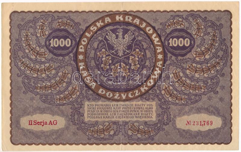 Lengyelország 1919. 1000M "II AG 231,769" T:VF Poland 1919. ... https://www.darabanth.com/de/473-Fernauktion/473.0/Numismatik/Weltweit-Banknoten~1500015/Lengyelorszag-1919-1000M-II-AG-231-769-TVF-Poland-1919-1000-Marek-II-AG-231-769-CVF-Krause-~II3203197