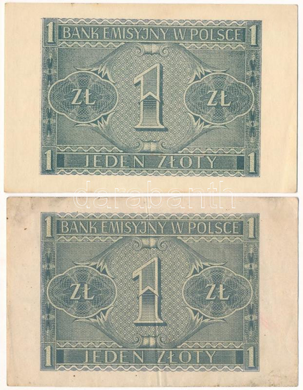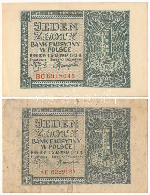 Lengyelország 1941. 1Zl (2x) T:VF,F Poland 1940. 1941. 1 Złoty (2x) C:... https://www.darabanth.com/de/473-Fernauktion/473.0/Numismatik/Weltweit-Banknoten~1500015/Lengyelorszag-1941-1Zl-2x-TVF-F-Poland-1940-1941-1-ZC582oty-2x-CVF-F-Krause-P2399~II3203434