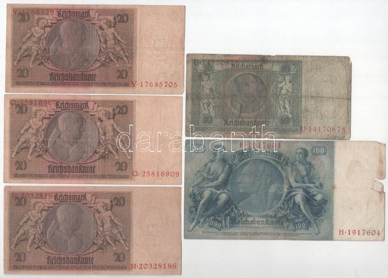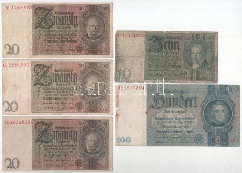 Németország / Weimari Köztársaság 1929. 10M + 20M (3x) + Német 3. Birodalom 1935. 100M T:F,VG Germany / Weimar Republic 1929. 10 Mark + 20 Mark (3x) + German Third Reich 1935. 100 Mark C:F,VG