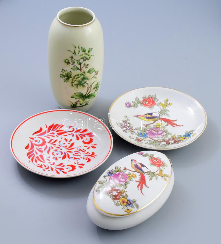 Beschreibung: Hollóházi 4 darab tárgy: váza, bonbonier, tálkák, klf mintával, jelzett, hibátlan.