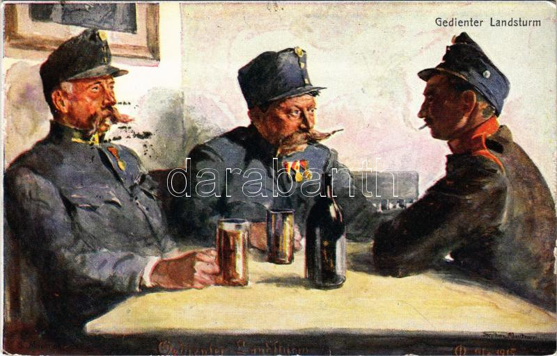 Gedienter Landsturm. Offizielle Karte für Rotes Kreuz, Kriegsfürsorgeamt, Kriegshilfsbüro Nr. 256. / WWI Austro-Hungarian K.u.K. military art postcard, soldiers drinking s: S. Mautner (EK)