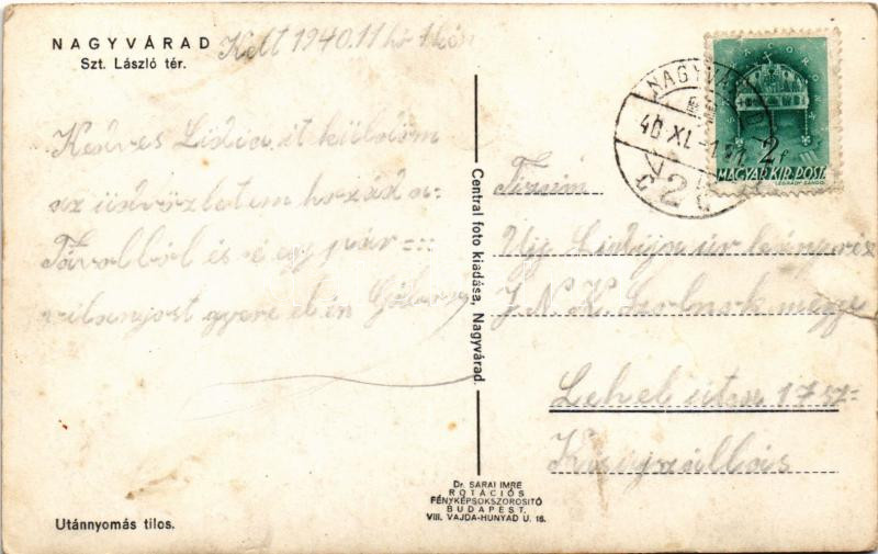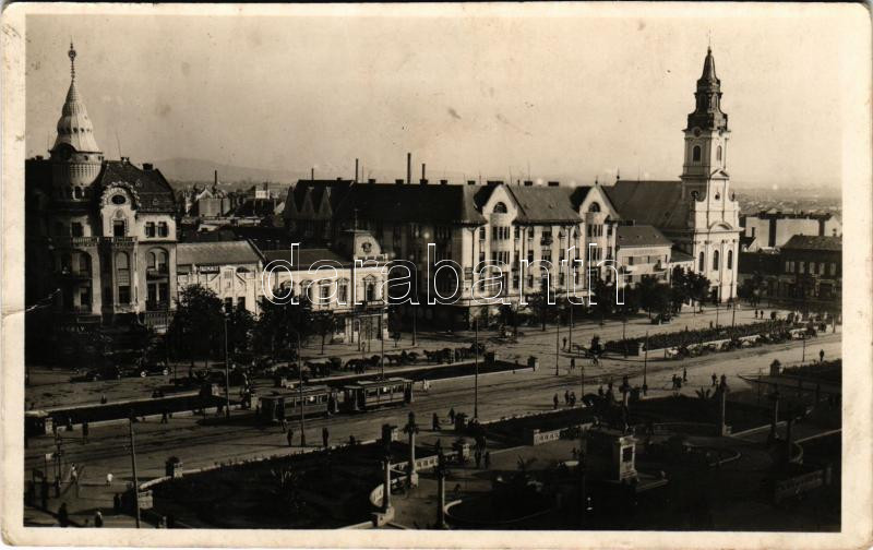 1940 Nagyvárad, Oradea; Szent László tér, villamos, gyógyszertár, üzletek, háttérben az ortodox zsinagóga / square, tram, pharmacy, shops, Orthodox synagogue in the background (fa)
