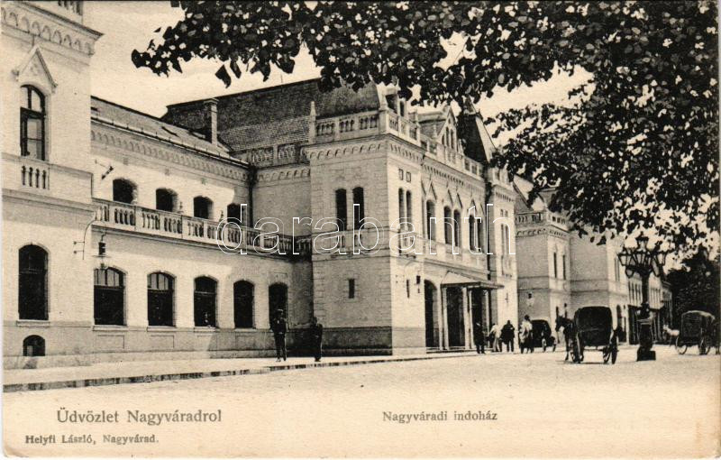 Beschreibung: Nagyvárad, Oradea; indóház, vasútállomás. Helyfi László kiadása. Cacaol reklám a hátoldalon / railway station. Advertisement on the backside