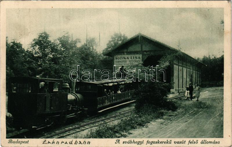 Beschreibung: 1928 Budapest XII. Svábhegy, Fogaskerekű vasút felső állomása, vasútállomás, gőzmozdony, vonat, Mona Lisa fényképészet reklámja (fl)