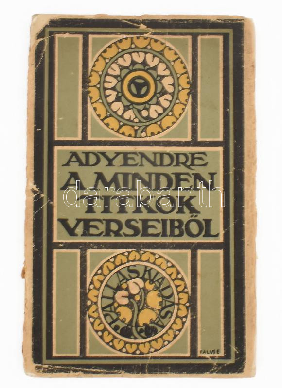 Ady Endre: A minden titkok versei. Bp., 1918., Pallas, 107+1 p. 2. kiadás.A borító Falus Elek munkája. Kiadói illusztrált papírkötés, sérült, kopott borítóval, a hátsó borító leszakadt.