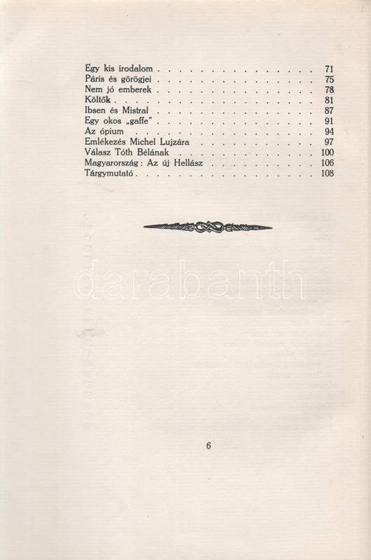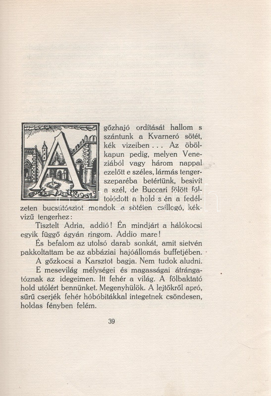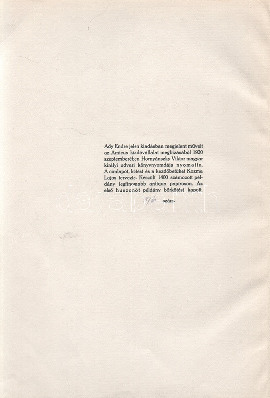 Ady Endre: Az új Hellász. [Karcolatok.] (Számozott.) Budapest, 1920. Amicus-kiadás (Hornyánszky Viktor ny.) 110 p. Egyetlen kiadás. A számozott, bibliofil kötet kolofonja: ,,Ady Endre jelen kiadásban megjelent műveit az Amicus kiadóvállalat megbízásából 1920 szeptemberében Hornyánszky Viktor királyi udvari könyvnyomdája nyomtatta. A címlapot, kötést és a kezdőbetűket Kozma Lajos tervezte. Készült 1400 számozott példány, legfinomabb antiqua papiroson. Az első huszonöt példány bőrkötést kapott. 196. szám". Ady Endre korai publicisztikáit Kozma Lajos fametszetei kísérik. A szenvedélyes hangon megírt, elfogulatlanságra nemigen törekvő karcolatok 1901-1907 között keletkeztek. Botka 24. Aranyozott kiadói egészvászon kötésben. Körülvágatlan, jó példány.