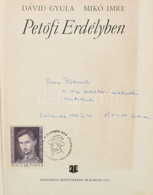 Dávid Gyula - Mikó Imre: Petőfi Erdélyben. (Dedikált!) Bukarest, 1972, Kriterion. Első kiadás. Kiadói egészvászon-kötés, kissé sérült, javított kiadói papír védőborítóban, a címlapon alkalmi bélyegzéssel. Az egyik szerző, Dávid Gyula (1928- ) erdélyi magyar irodalomtörténész, szerkesztő, műfordító által Veress Péter (1928- ) közgazdász, politikus részére dedikált példány.