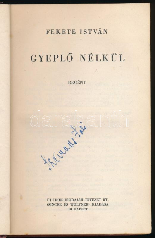 Fekete István: Gyeplő nélkül. Bp.,1947,Új Idők (Singer és Wolfner.),(Szikra-ny.), 234 p. Első kiadás. Kiadói félvászon-kötés, kissé kopott, kissé foltos borítóval.