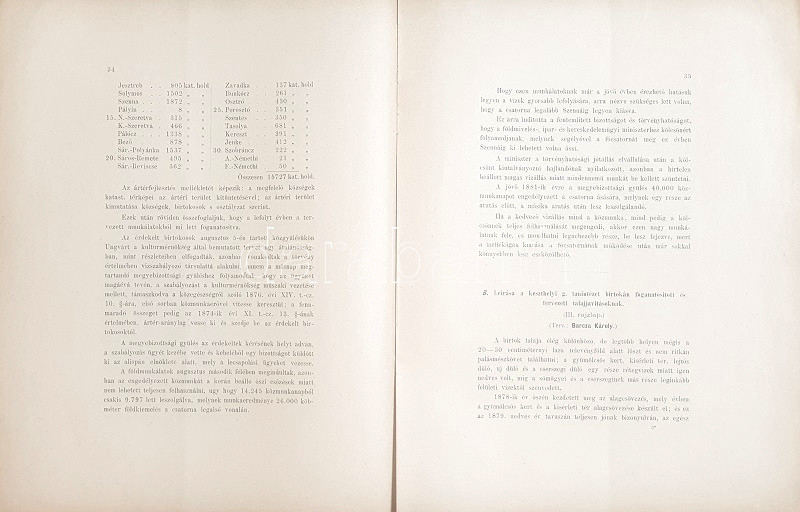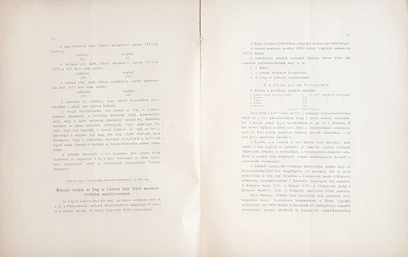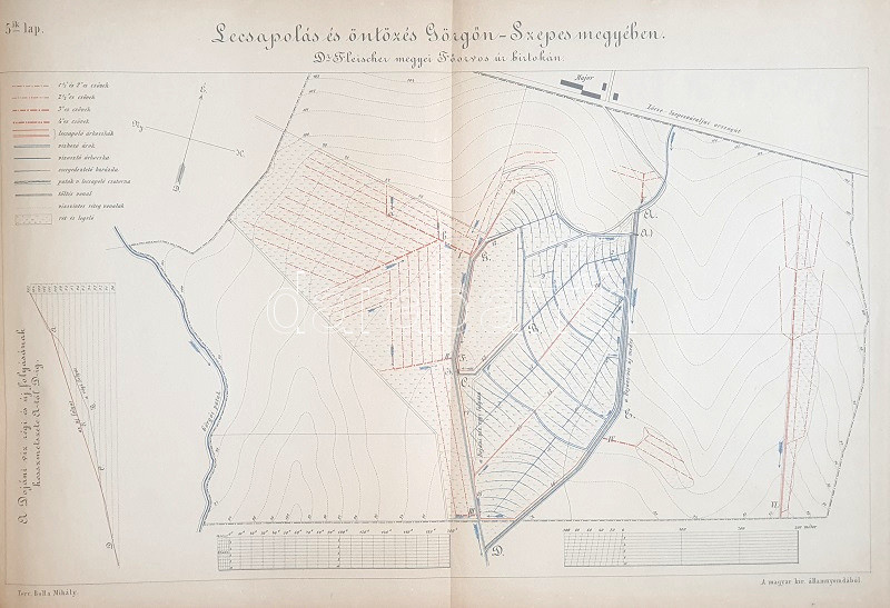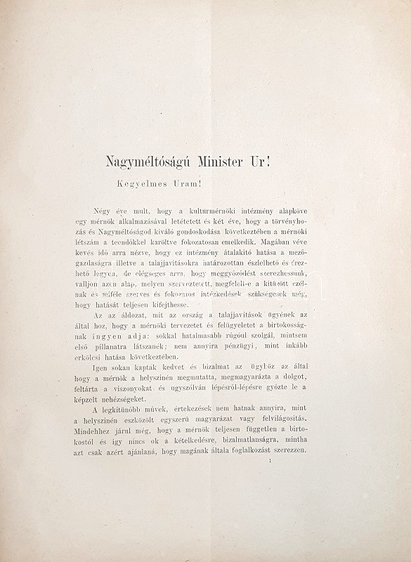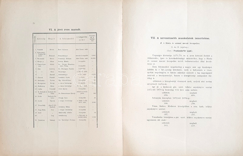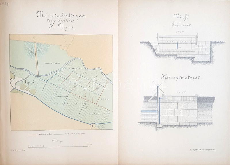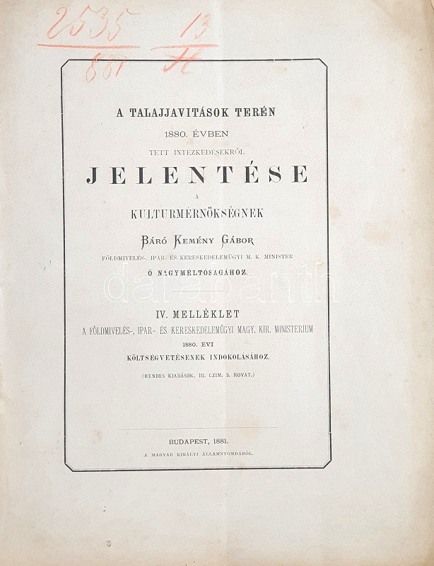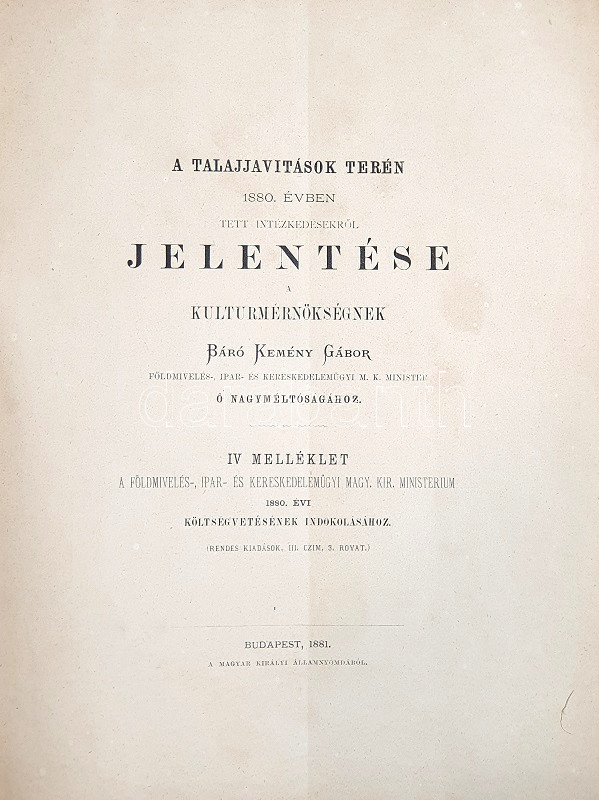 (Kvassay Jenő): A talajjavítások terén 1880. évben tett intézkedésekről jelentése a kulturmérnökségnek báró Kemény Gábor földmívelés-, ipar- és kereskedelemügyi m. k. Minister Ő Nagyméltóságához. IV melléklet: A Földmívelés-, Ipar- és Kereskedelemügy Magy. Kir. Ministerium 1880. évi költségvetésének indoklásához. Budapest, 1881. Magyar Királyi Államnyomda. [2] + 56 p. + 5 térkép (színes, kihajtható). Jelentés a hazai, államilag is támogatott kultúrmérnöki munkálatokról. Kultúrmérnöki munkálatok alatt általánosságban utak, vasutak, hidak, valamint vízi és mezőgazdasági mérnöki tervezést követő kivitelezést kell érteni, dokumentumunk azonban szűkebb értelemben használja az általános fogalmat: a Magyarország különböző területein kivitelezett (és tervezett) csatornázási, alagcsövezési, lecsapolási és folyószabályozási munkálatokról beszél, ezek költségvetéséről, illetve várható mezőgazdasági hasznáról. A színes, kihajtható térképmellékleteken az Ung folyó menti, Szepes és Heves vármegyei, valamint keszthelyi munkálatok átnézeti térképe és kísérő ábrái. Az első borítón régi katalógusszám, a hátsó borítón egykori gyűjteményi bélyegzés. BOEH IV: 2378. Fűzve, enyhén sérült kiadói borítóban.