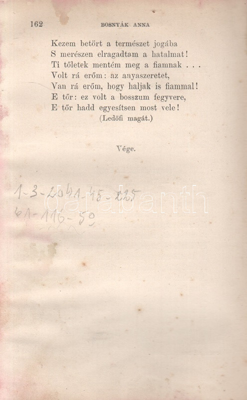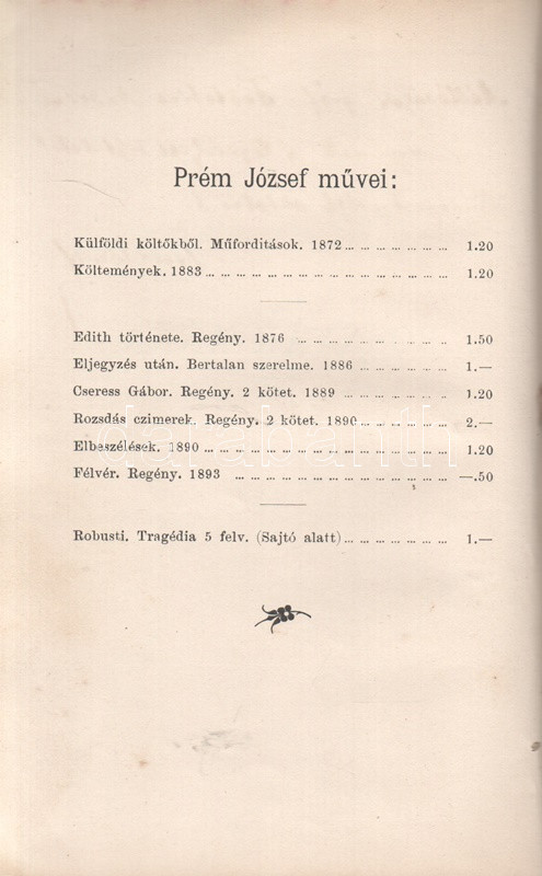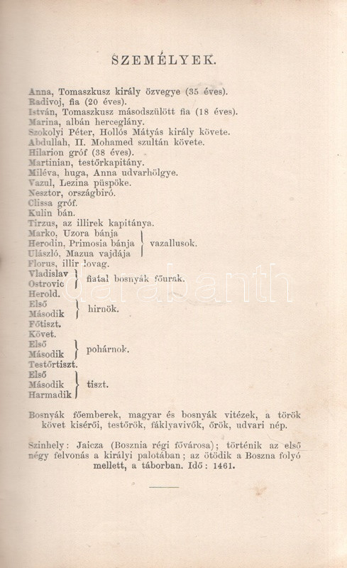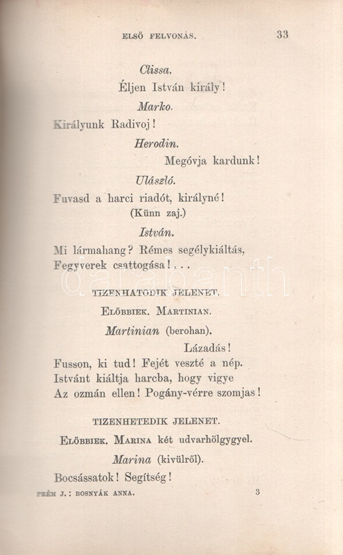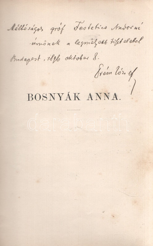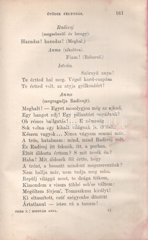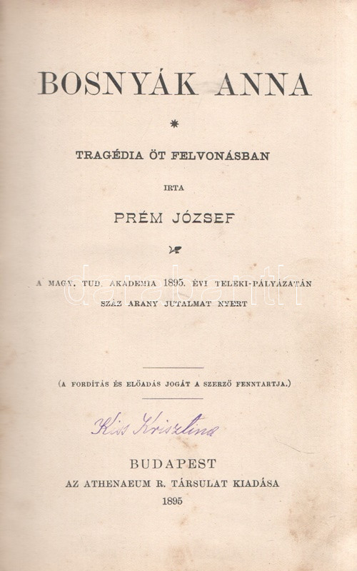 Prém József: Bosnyák Anna. Tragédia öt felvonásban. (Dedikált.) Budapest, 1895. Athenaeum Rt. (ny.) [8] + 162 p. Egyetlen kiadás. Dedikált: ,,Méltóságos gróf Festetics Andorné únnőnek a legmélyebb tisztelettel Prém József. Budapest, 1896. október 8." Prém József (1850-1910) író, drámaíró, újságíró pályaműve a Magyar Tudományos Akadémia által kiírt 1894. évi Teleki-pályázaton száz arany jutalmat nyert. A késő dualizmus korában nem kisebb intézmény, mint a Magyar Tudományos Akadémia írt ki drámapályázatokat különböző színházi műfajokban a nemzeti dráma fejlesztésének célzatával. A Teleki-pályázat szigorú megkötései verses formájú szomorújátékokat írtak elő, lehetőség szerint történelmi, azon belül is magyar történelmi tárgyban. Az éves termést az Akadémiai Értesítő vonatkozó füzetei ismertették, általában szórakoztatóan részletezve mindazt, hogy az az évi beküldött pályázatok mily kevéssé érdemelnek jutalmazást kulisszahasogató megoldásaik, lélektani valószínűtlenségeik vagy bárgyú ötleteik miatt. Ennek ellenére a pályázatot minden évben megrendezték, majd a beküldött eredmények felett a bíráló bizottság jobbára véres tort ült. Prém József a korszak sikeresebb drámapályázói közé tartozik, háromszor is elnyerte a Teleki-pályázat fokozatainak egyikét. A verses tragédia a XV. századi Jajcában játszódik, és az emelt nyelven megírt leszámolási tragédiák számát gyarapítja. A vérgőzös dráma premierjéről nincs adatunk. A címoldalon régi tulajdonosi bejegyzés, néhány oldalon halvány foltosság. Aranyozott, festett, enyhén foltos kiadói egészvászon kötésben, vörös festésű lapszélekkel. Jó példány.