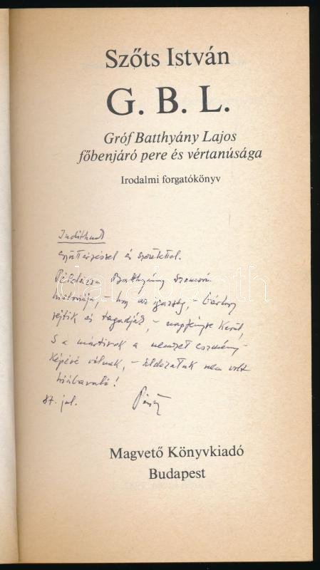 Szőts István: G. B. L. Gróf Batthyány Lajos főbenjáró pere és vértanúsága. Irodalmi forgatókönyv. Szőts István (1912-1998) Kossuth-díjas filmrendező által Maléter Pálné Gyenes Judit (1932-2019), Maléter Pál 1956-os honvédelmi miniszter özvegye részére DEDIKÁLT! Bp., 1987, Magvető. Kiadói papírkötés.