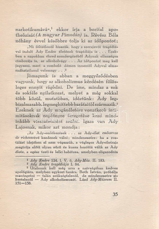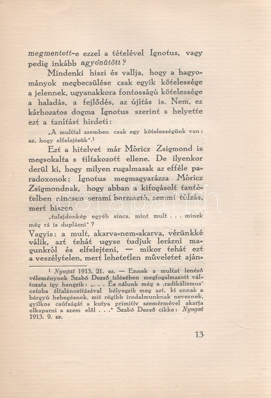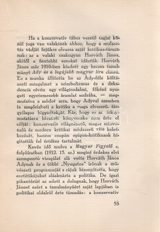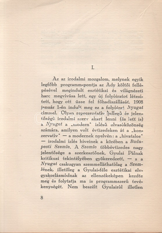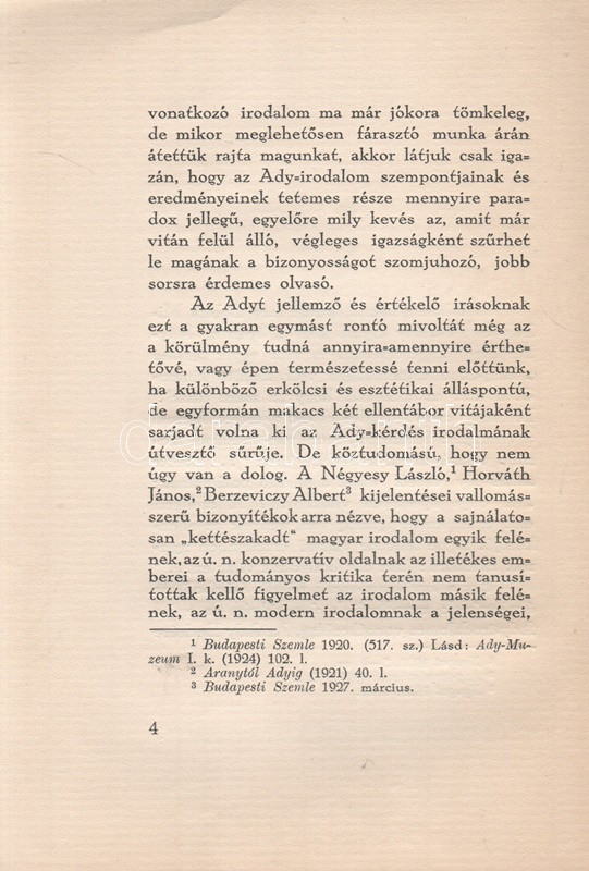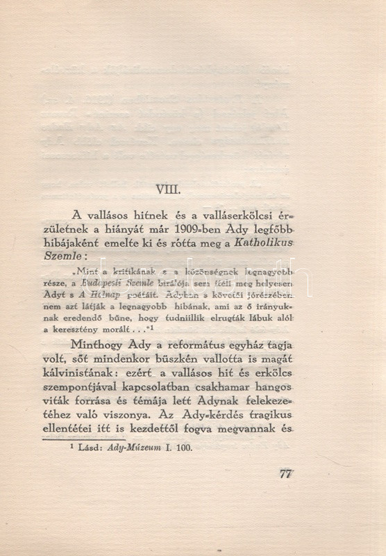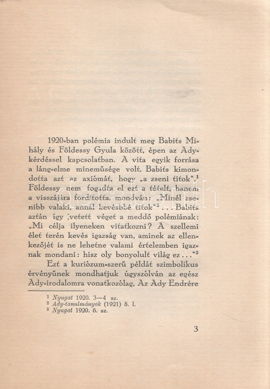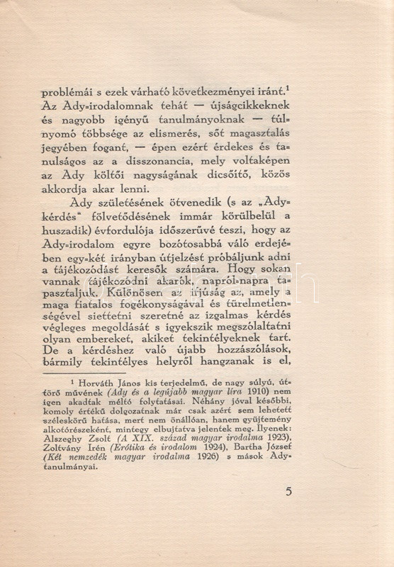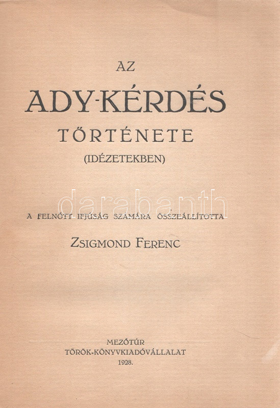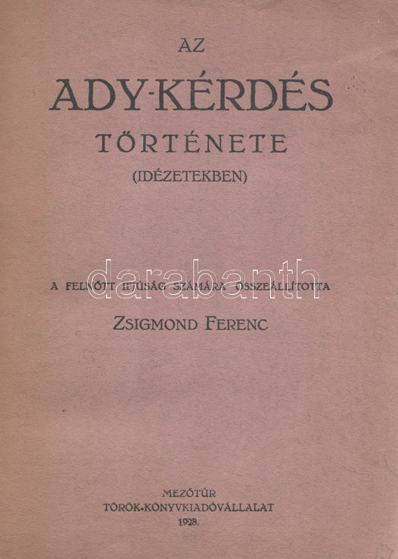 Zsigmond Ferenc (összeáll.): Az Ady-kérdés története (idézetekben). A felnőtt ifjúság számára összeállította Zsigmond Ferenc. Mezőtúr, 1928. Török-könyvkiadóvállalat és nyomda. 143 + [1] p. Egyetlen kiadás. Zsigmond Ferenc (1883-1949) irodalomtörténész, Jókai-, Mikszáth- és Ady-kutató, az akkoriban inkább konzervatív intézménynek számító Magyar Tudományos Akadémiának rendes tagja. Mértéktartó összefoglalásában ismerteti az Ady Endre költői munkássága körül kialakult, politikai felhangokkal kevert esztétikai vitát, bemutatja Ady kultikus és kritikus méltatóit egyaránt, és kissé fájlalja, hogy konzervatív irányból Horváth János irodalomtörténész alapos kritikáján kívül nem született érdemi Ady-elemzés, a költő nyugatos társai pedig Babits Mihály kivételével sokkal inkább a rajongás, mint az esztétikai távolságtartás hangján szólaltak meg. A Zsigmond Ferenc által írt Ady-pályakép így sokkal kevésbé a művekre magára, mint az Ady körüli csatározások hevességére koncentrál, ám ennek ellenére az Ady-bibliográfia gyakran idézett tételét képezi. Tezla 69. Fűzve, feliratozott, enyhén sérült kiadói borítóban. Körülvágatlan, jó példány.