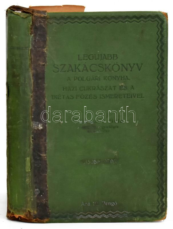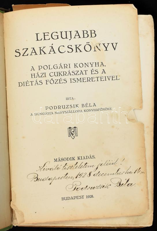 Podruzsik Béla: Legújabb szakácskönyv. A polgári konyha, házi cukrászat és a diétás főzés ismereteivel. DEDIKÁLT! II. kiadás. Bp., (1928.), Otthon-ny., 1-14, 17-311 p. Javított gerincű egészvászon-kötésben, kopott, foltos borítóval, sérült gerinccel, foltos, kijáró lapokkal, néhány lapon aláhúzással, egy laphoz jegyzetlapot tűztek, egy laphiánnyal (15/16.)